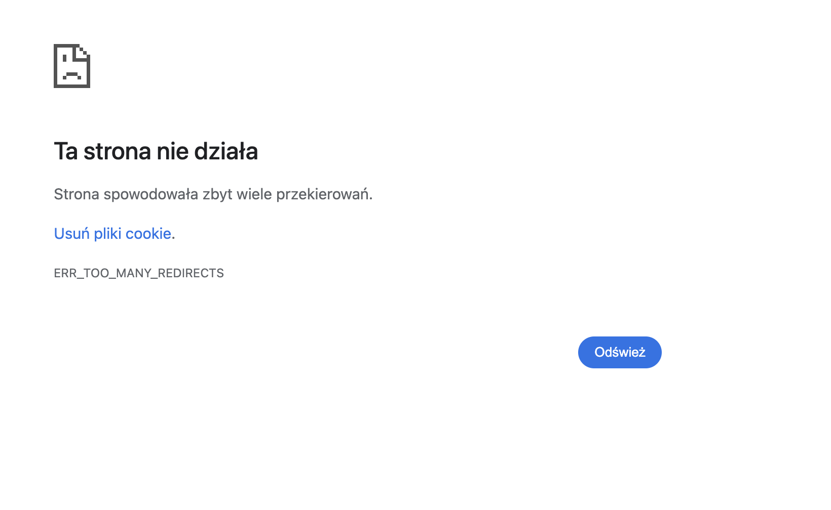 Otrzymałeś komunikat ERR_TOO_MANY_REDIRECTS ponieważ przeglądarka przerwała ładowanie witryny. Mechanizm ten chroni zasoby systemowe przed wejściem w nieskończoną pętlę żądań sieciowych. Wina leży tu niemal zawsze po stronie serwera lub logiki aplikacji a nie twojego łącza czy komputera.
